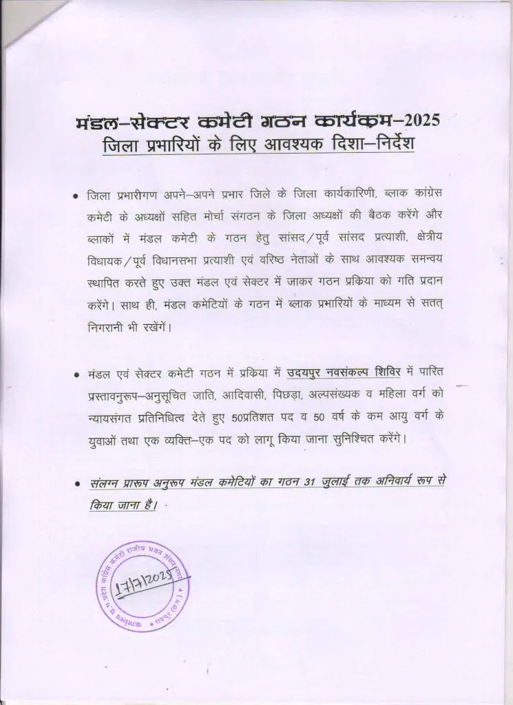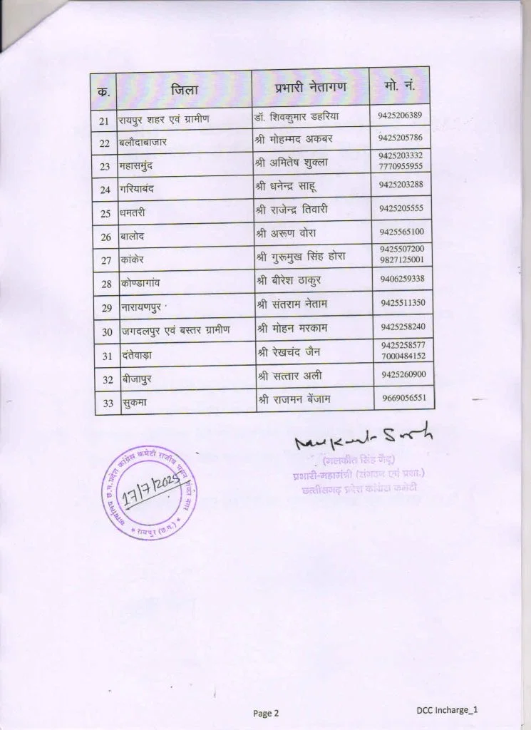 रायपुर। संगठनात्मक मजबूती के लिए छत्तीसगढ़ प्रदेश कांग्रेस कमेटी (PCC) ने बड़ा कदम उठाते हुए सभी 33 जिलों में नए जिला प्रभारियों की नियुक्ति की है। यह फैसला राष्ट्रीय अध्यक्ष मल्लिकार्जुन खड़गे के निर्देश पर लिया गया है। मुख्य उद्देश्य मंडल और सेक्टर कमेटियों का शीघ्र पुनर्गठन करना है।