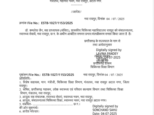 रायपुर, 4 जुलाई। छत्तीसगढ़ शासन ने शुक्रवार को एक अहम प्रशासनिक निर्णय लेते हुए संविदा नियुक्ति पर कार्यरत डॉ. कमलेश जैन के संचालनालय से संबंधित समस्त आबंटित कार्यों को समाप्त कर दिया है। शासन द्वारा जारी आदेश के अनुसार, डॉ. जैन का संलग्नीकरण भी तत्काल प्रभाव से समाप्त कर दिया गया है।