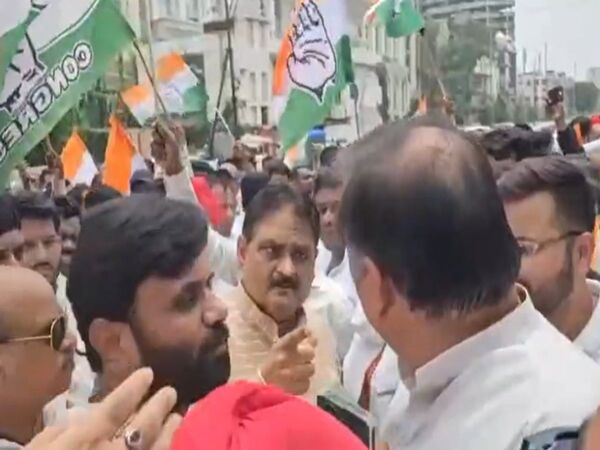 प्रदर्शन के दौरान कांग्रेस नेताओं में भिड़ंत