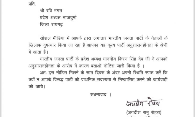 रायपुर, 26 जुलाई 2025। भारतीय जनता पार्टी, छत्तीसगढ़ प्रदेश कार्यालय द्वारा भाजयुमो के प्रदेश अध्यक्ष रवि भगत को कारण बताओ नोटिस जारी किया गया है। नोटिस में उन्हें सोशल मीडिया पर पार्टी के नेताओं के खिलाफ लगातार दुश्मनाना टिप्पणी करने और अनुशासनहीनता के आरोप में जवाब तलब किया गया है।