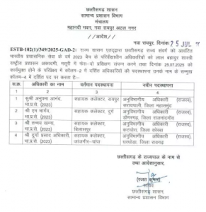 रायपुर, 28 जुलाई 2025। छत्तीसगढ़ शासन के सामान्य प्रशासन विभाग ने 2023 बैच के भारतीय प्रशासनिक सेवा (IAS) के चार परिवीक्षाधीन अधिकारियों की पदस्थापना सूची जारी कर दी है। ये सभी अधिकारी लाल बहादुर शास्त्री राष्ट्रीय प्रशासन अकादमी, मसूरी में फेस-2 प्रशिक्षण पूरा करने के बाद 25 जुलाई को कार्यमुक्त हुए थे।