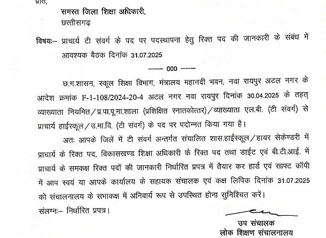 रायपुर, 29 जुलाई 2025। छत्तीसगढ़ में शैक्षणिक प्रशासनिक ढांचे को मजबूत करने की दिशा में प्राचार्य प्रमोशन की प्रक्रिया तेज कर दी गई है। पहले चरण में टी संवर्ग (T Cadre) के प्रचार्यों की काउंसलिंग की जाएगी। इसके लिए स्कूल शिक्षा विभाग के अधीन संचालित DPI (निदेशालय लोक शिक्षण) ने सभी जिलों के जिला शिक्षा अधिकारियों (DEO) से रिपोर्ट तलब की है।