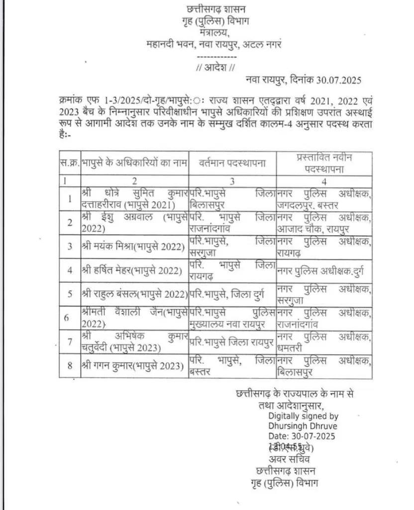 रायपुर, 30 जुलाई 2025. छत्तीसगढ़ सरकार ने एक बार फिर बड़ा प्रशासनिक फेरबदल करते हुए 8 भारतीय पुलिस सेवा (IPS) अधिकारियों का तबादला किया है। इस संबंध में गृह विभाग ने आधिकारिक आदेश जारी कर दिए हैं।