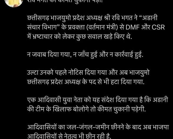 भूपेश बघेल ने सोशल मीडिया प्लेटफ़ॉर्म X पर लिखा “रवि भगत को कीमत चुकानी पड़ी। उन्होंने ‘अडानी संचार विभाग’ के प्रवक्ता (वर्तमान मंत्री) से DMF और CSR में भ्रष्टाचार पर सवाल किए थे। न तो जवाब मिला, न जांच हुई, न कार्रवाई हुई। उल्टा पहले नोटिस दिया गया और अब उन्हें अध्यक्ष पद से भी हटा दिया गया।”