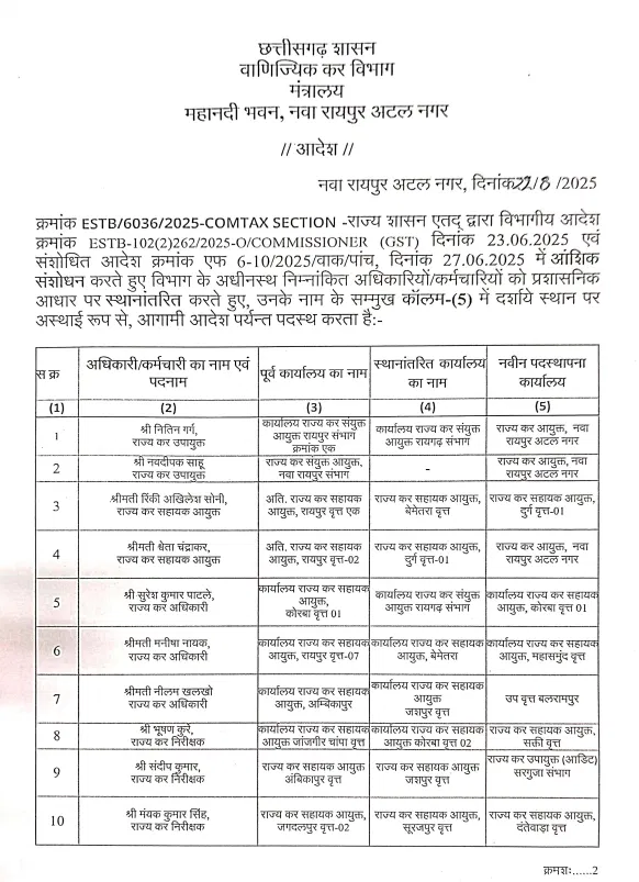 रायपुर। छत्तीसगढ़ में GST विभाग के भीतर आज बड़ी प्रशासनिक सर्जरी की गई। वाणिज्यिक कर (GST) विभाग ने 23 जून और 27 जून 2025 को जारी किए गए आदेशों में आंशिक संशोधन करते हुए 10 अधिकारी-कर्मचारियों की नई पदस्थापना सूची जारी की है।