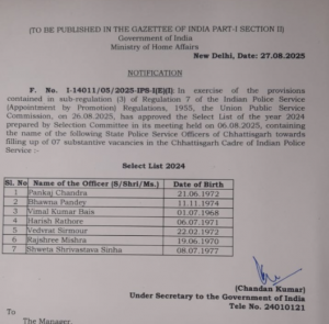 रायपुर। छत्तीसगढ़ पुलिस विभाग के लिए गौरव का दिन है। राज्य पुलिस सेवा (SPS) के सात अधिकारियों को भारतीय पुलिस सेवा (IPS) अवार्ड मिला है। अब ये सभी अधिकारी IPS कैडर का हिस्सा बन गए हैं। यह सम्मान उनके सेवा और कर्तव्यनिष्ठा का बड़ा प्रमाण माना जा रहा है।