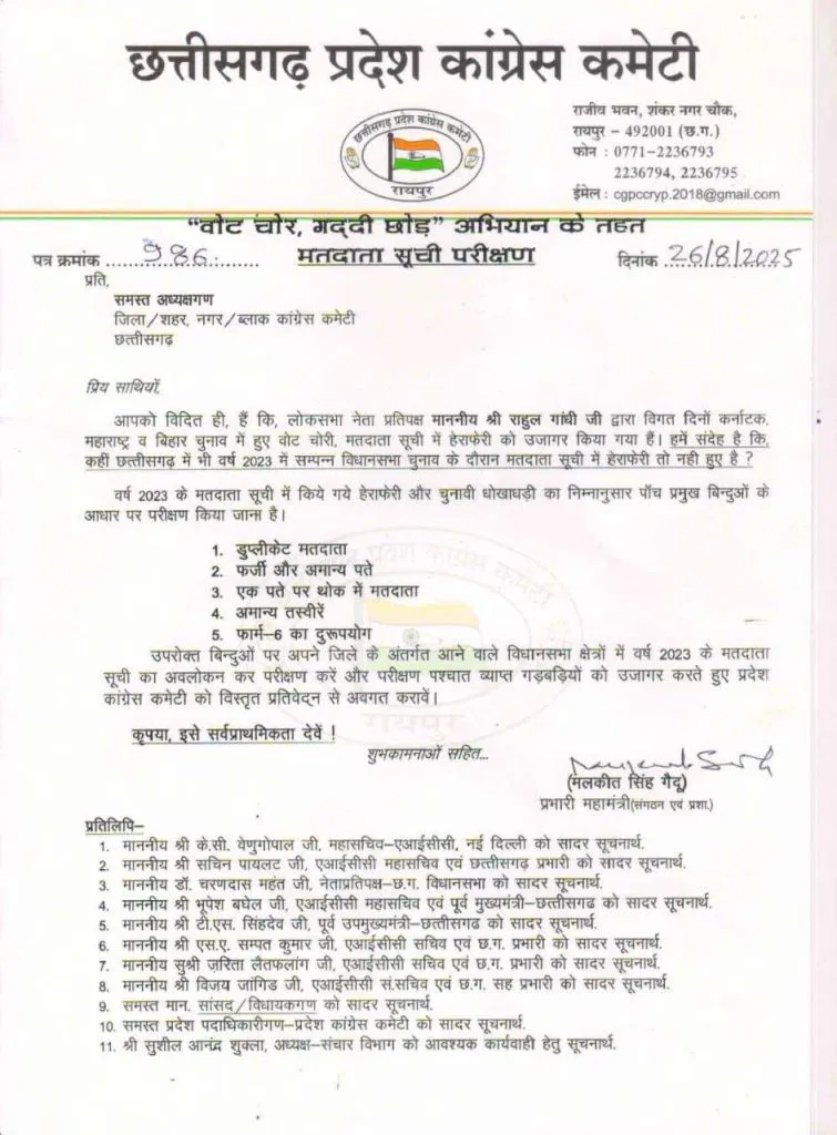 रायपुर। वोट चोरी के आरोपों को लेकर कांग्रेस ने अब छत्तीसगढ़ में बड़ा कदम उठाया है। प्रदेश कांग्रेस कमेटी (PCC) ने सभी जिलाध्यक्षों को आदेश जारी करते हुए हर विधानसभा की मतदाता सूची का परीक्षण करने को कहा है। जिलाध्यक्षों से चार बिंदुओं पर विस्तृत रिपोर्ट तैयार कर PCC में जमा करने के निर्देश दिए गए हैं।