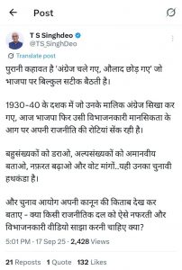 रायपुर। छत्तीसगढ़ की सियासत एक बार फिर गरमा गई है। पूर्व डिप्टी सीएम और कांग्रेस नेता टीएस सिंहदेव ने सोशल मीडिया प्लेटफॉर्म X पर बीजेपी पर तीखा हमला बोला। अपने ट्वीट में उन्होंने बीजेपी को “अंग्रेजों का औलाद” बताते हुए कहा कि उनकी सोच हमेशा जनता के खिलाफ रही है।