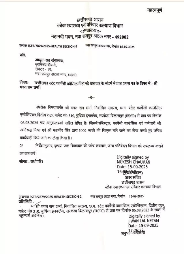 RAIPUR BRIBERY CASE | फार्मेसी काउंसिल में रिश्वत की जांच के लिए स्वास्थ्य विभाग ने मांगी रिपोर्ट