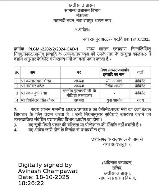 रायपुर। धनतेरस के दिन मुख्यमंत्री विष्णुदेव साय की सरकार ने बड़ा प्रशासनिक फैसला लेते हुए अपने मीडिया सलाहकार और तीन आयोग अध्यक्षों को मंत्री का दर्जा देने की घोषणा की है।