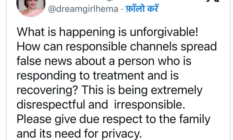 हेमा मालिनी ने भी ट्वीट कर लिखा कि ऐसे झूठे समाचार फैलाना असम्मानजनक और गैर-जिम्मेदाराना है। उन्होंने कहा कि धर्मेंद्र इलाज पर अच्छी प्रतिक्रिया दे रहे हैं और स्वस्थ हो रहे हैं। उन्होंने फैंस और मीडिया से परिवार की निजता का सम्मान करने की अपील की।