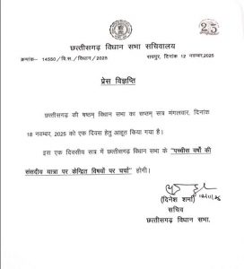 रायपुर। छत्तीसगढ़ विधानसभा का एक दिवसीय विशेष सत्र 18 नवंबर को बुलाया गया है। यह सत्र राज्य की संसदीय यात्रा के 25 वर्ष पूरे होने के अवसर पर आयोजित किया जा रहा है। सत्र में सभी विधायक अब तक की संसदीय यात्रा और अनुभव साझा करेंगे।