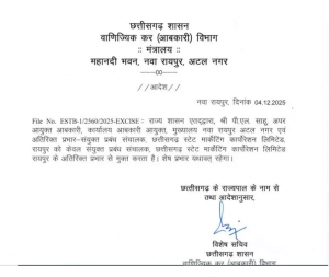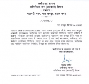 रायपुर। आबकारी मंत्री लखनलाल देवांगन ने बुधवार को बड़ी प्रशासनिक कार्रवाई करते हुए विभाग के दो वरिष्ठ अधिकारियों को तुरंत प्रभाव से उनके मूल विभागों में वापस भेज दिया है। वाणिज्यिक कर विभाग के विशेष सचिव द्वारा जारी आदेश के मुताबिक, ब्रेवरेज कॉर्पोरेशन के महाप्रबंधक और स्टेट मार्केटिंग कंपनी के जॉइंट एमडी के पद पर लंबे समय से कार्यरत दोनों अधिकारियों को हटा दिया गया है।
