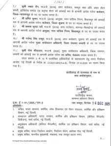 प्रशासनिक फेरबदल के तहत प्रकाश कुमार सर्वे को बिलासपुर नगर निगम का आयुक्त नियुक्त किया गया है। इसके साथ ही गजेंद्र ठाकुर को धमतरी जिला पंचायत का सीईओ बनाया गया है।