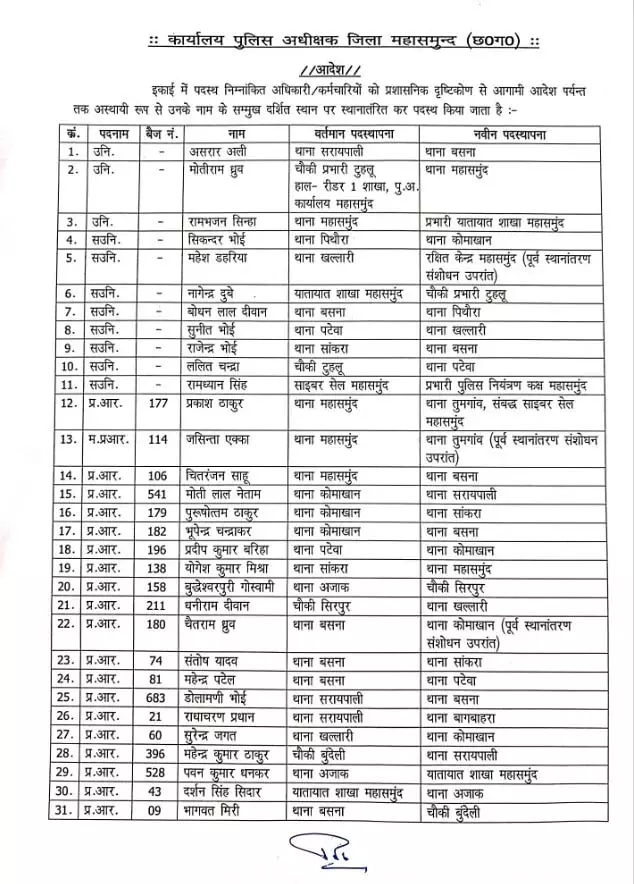 महासमुंद। जिले में पुलिस प्रशासन को और चुस्त-दुरुस्त करने के लिए बड़े पैमाने पर तबादले किए गए हैं। वरिष्ठ अधिकारियों के निर्देश पर एसपी महासमुंद ने जिले के अलग-अलग थानों और इकाइयों में पदस्थ कुल 38 पुलिसकर्मियों का स्थानांतरण किया है।