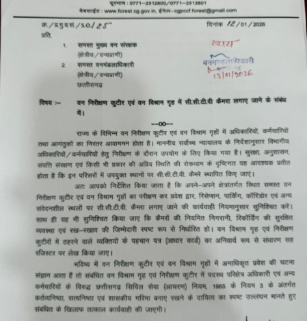 सीसीएफ को लिखे पत्र में साफ कहा गया है कि प्रवेश द्वार, रिसेप्शन, पार्किंग, कॉरिडोर और सभी संवेदनशील स्थानों पर अनिवार्य रूप से सीसीटीवी कैमरे लगाए जाएं। सुरक्षा, अनुशासन और सरकारी संपत्ति की सुरक्षा के साथ-साथ किसी भी अप्रिय घटना को रोकने के लिए निगरानी जरूरी बताई गई है।