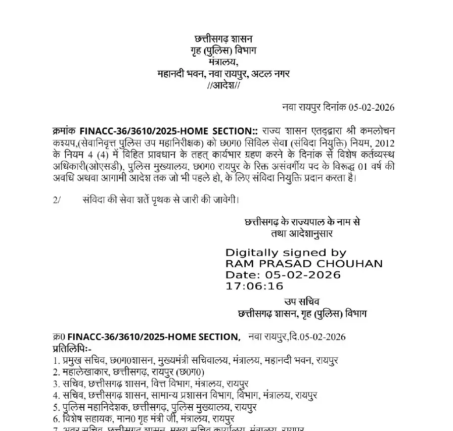 जारी आदेश के अनुसार, छत्तीसगढ़ सिविल सेवा (संविदा नियुक्ति) नियम, 2012 के नियम 4(4) के तहत श्री कमलोचन कश्यप को कार्यभार ग्रहण करने की तिथि से OSD, पुलिस मुख्यालय, छत्तीसगढ़ रायपुर के रिक्त असंवर्गीय पद पर नियुक्त किया गया है। यह नियुक्ति 01 वर्ष की अवधि या आगामी आदेश तक, जो भी पहले हो, के लिए प्रभावी रहेगी।