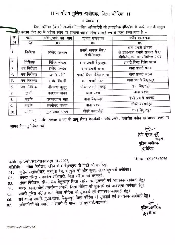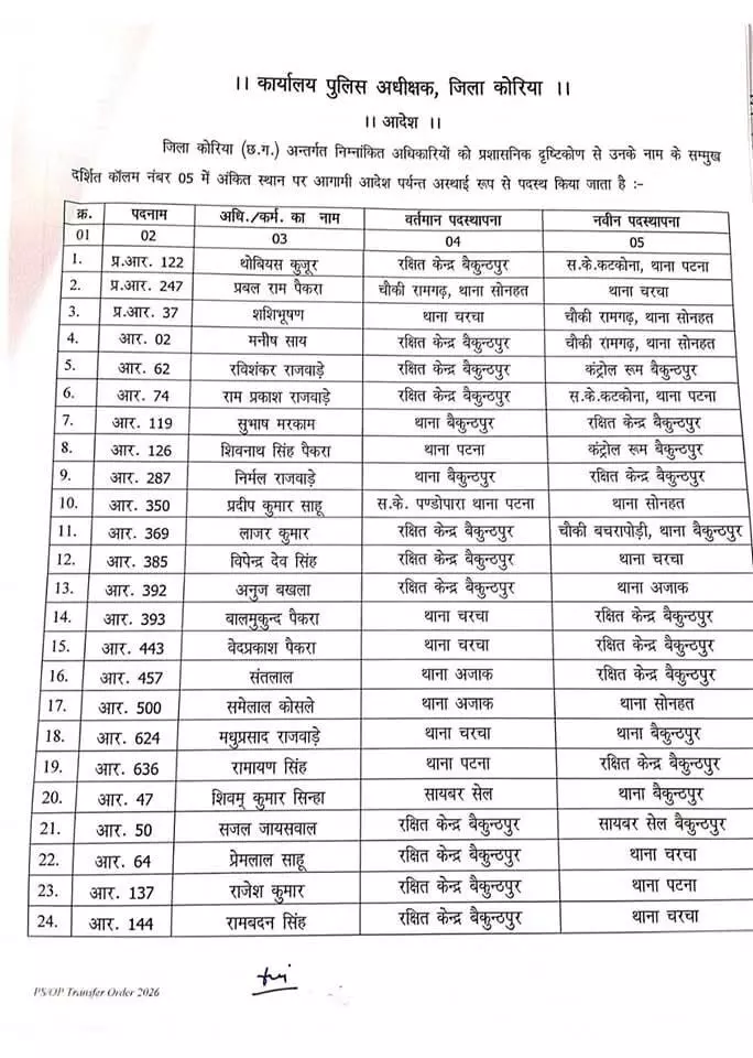 रायपुर। कोरिया जिले में पुलिस महकमे में बड़ा प्रशासनिक फेरबदल किया गया है। एसपी रवि कुमार कुर्रे ने टीआई, एसआई, एएसआई सहित कुल 69 पुलिसकर्मियों के तबादले का आदेश जारी किया है। आदेश तत्काल प्रभाव से लागू कर दिया गया है।