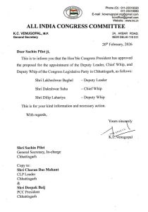 रायपुर। छत्तीसगढ़ विधानसभा के बजट सत्र से पहले प्रदेश कांग्रेस ने संगठनात्मक फेरबदल करते हुए अहम नियुक्तियों की घोषणा की है। सदन में रणनीति को धार देने के उद्देश्य से पार्टी ने उपनेता प्रतिपक्ष और सचेतक पदों पर बदलाव किया है।