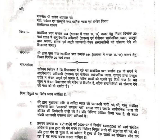साहू का आरोप है कि विधानसभा में इस ट्रस्ट से जुड़े सवाल पर जो जवाब दिया गया, वो अधूरा और भ्रामक था। यानी मामला सिर्फ गड़बड़ी का नहीं, बल्कि जानकारी छिपाने तक पहुंच गया है।