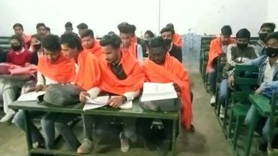 अलीगढ़: हिजाब के विरोध में छात्र भगवा कपड़ा पहनकर पहुंचे क्लास, किया प्रदर्शन