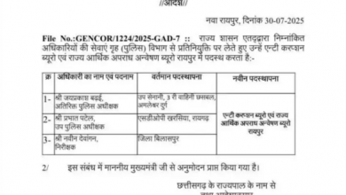 रायपुर, 30 जुलाई 2025। छत्तीसगढ़ शासन ने पुलिस विभाग में एक अहम प्रशासनिक आदेश जारी किया है। इसमें तीन…